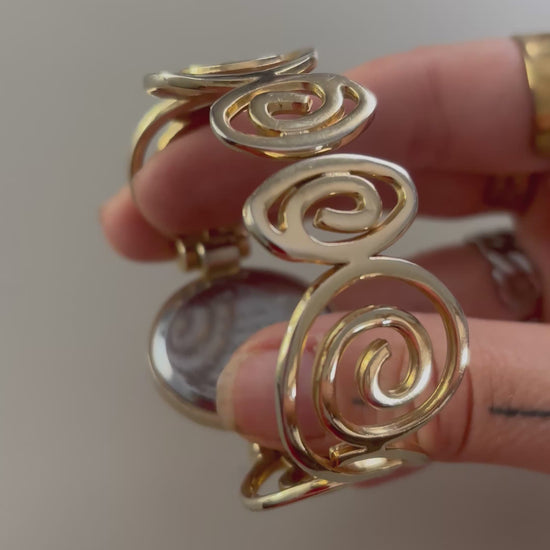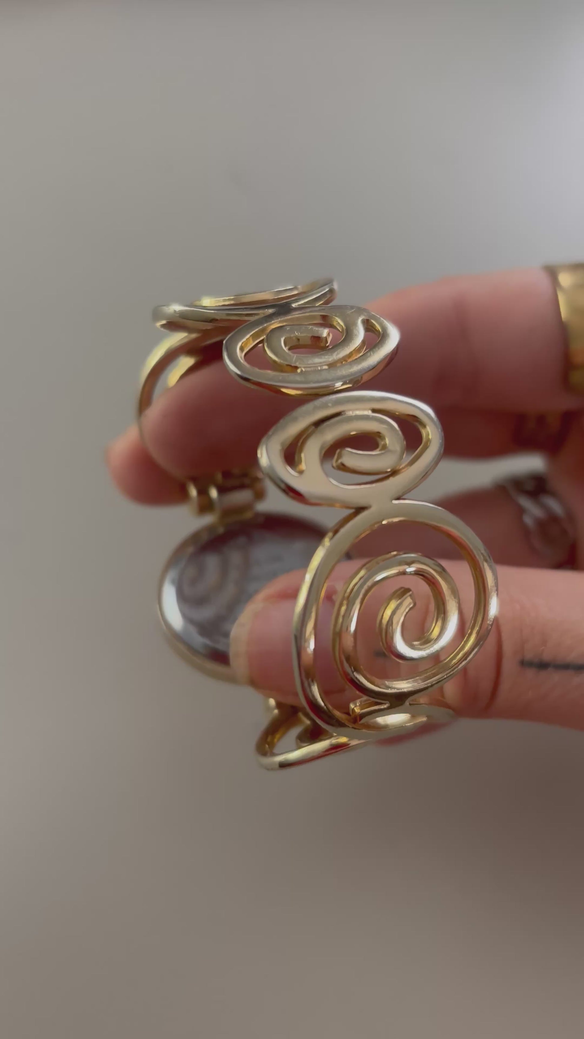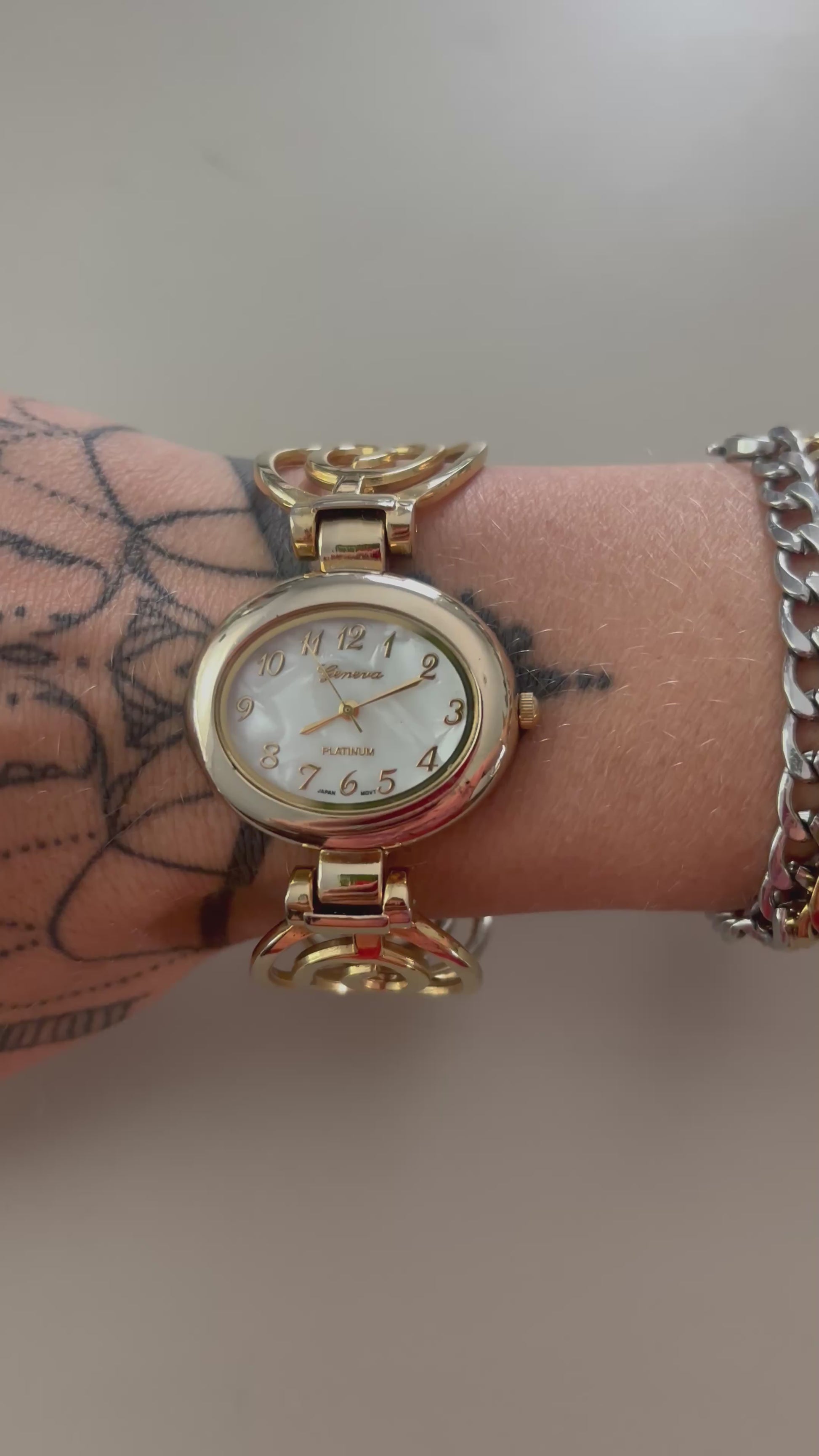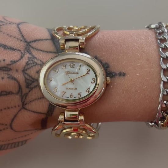 The cutest second hand vintage watch in gold with a pearl face and spiral detailing around the cuff